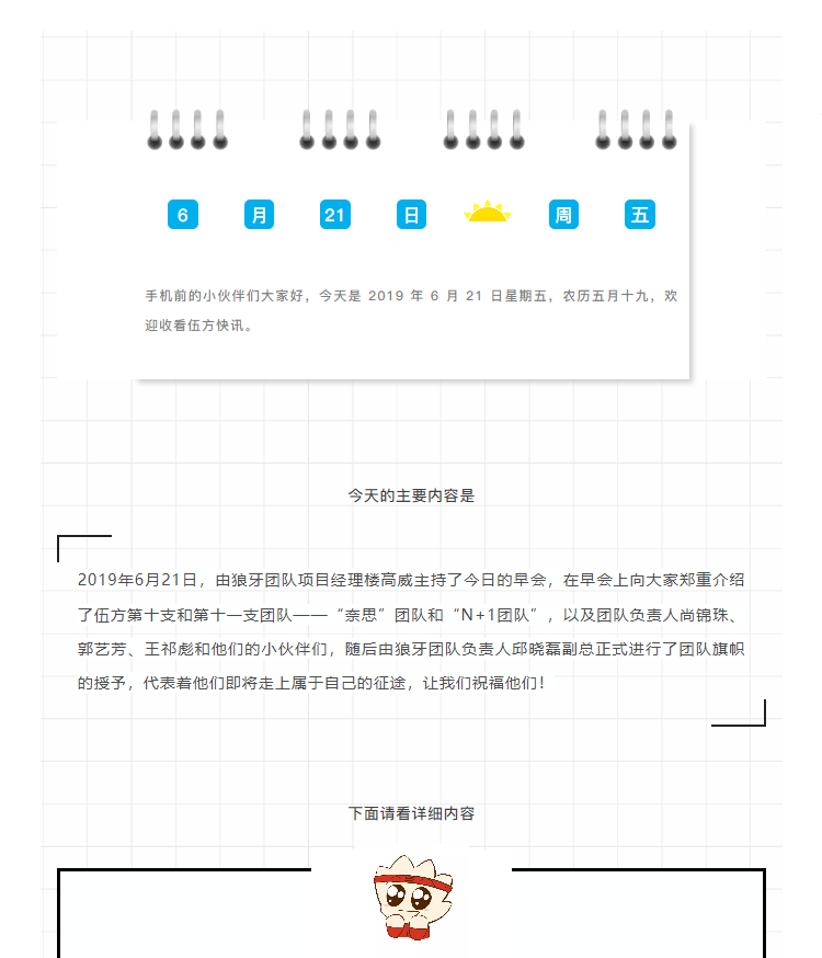 上一篇:伍方資訊丨伍方第十團(tuán)隊“奈思”與第十一團(tuán)隊“N+1”今日正式出道!