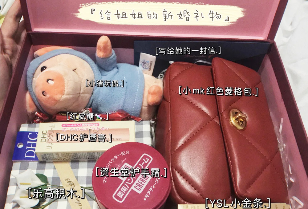 ysl小金條、小mk紅色菱格包、婚禮系列樂高積木、資生堂護(hù)手霜、DHC護(hù)唇膏、一只公仔、俄羅斯紅皮糖果、手寫信。